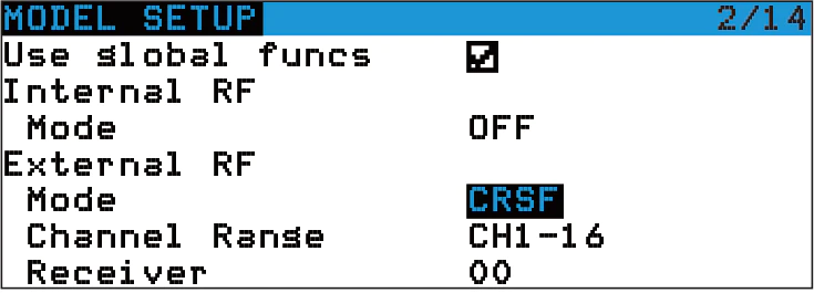 ExpressLRS uses the Crossfire serial protocol (AKA CRSF protocol) to communicate between the radio transmitter and the TX module. So make sure your radio transmitter supports the CRSF serial protocol. We use the radio transmitter with the OpenTX system to show how to set up the CRSF protocol and LUA script. To set this up, in the OpenTX system, enter into model settings, and on the “MODEL SETUP” tab, turn off the “Internal RF”. Next, enable “External RF” and select “CRSF” as the protocol.