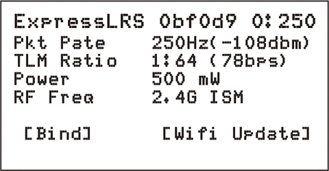 - When entering OLED menus page with long pressing, the connection between RF TX module and receiver works normally. Please do not change the Pkt Rate, otherwise, you must re-power the receiver.