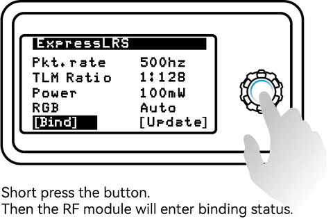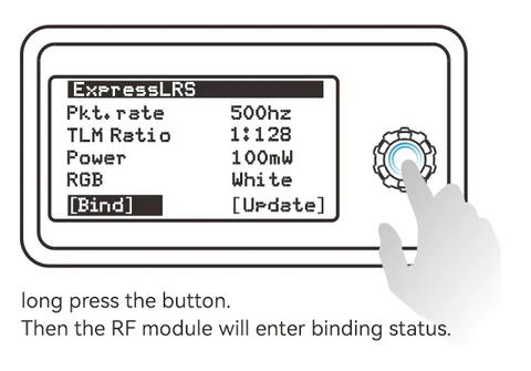 The Micro RF TX module comes with officially major release V1.1.0 or V2.0.0 protocol and no Binding Phrase included. So please make sure the receiver works on officially major release V1.0.0~V1.1.0 or V2.0.0 protocol. And no Binding Phrase set. Micro RF TX module could enter binding status via ELRS.lua or ELRSV2.lua script, as described in “LUA Script” chapter. Besides, using the button and OLED, move to the BIND position and long-press the button. Short press the button if it is V2.0.0. Then the RF module will enter binding status.