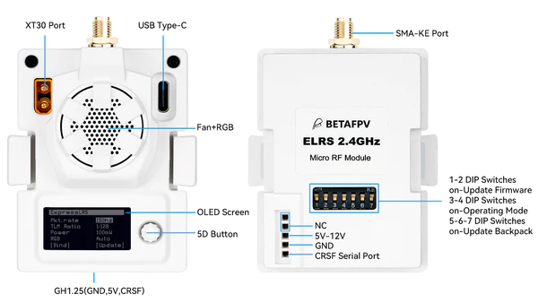 The black version with maximum 1W RF output power is released now. Support all 5D button dimensions based on BETAFPV ELRS V2.0.0 firmware. A new backpack function is added, allowing wireless communication between ExpressLRS, and other FPV related devices for command and control, or for querying config.