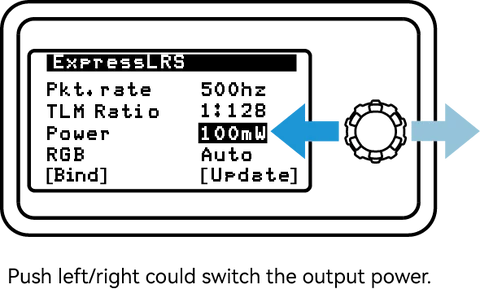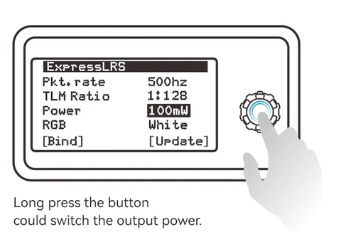 Micro RF TX module could switch the output power via ELRS.lua or ELRSV2.lua script, as described in “LUA Script” chapter. Besides, using the button and OLED, move to the Output position. Switch the output power by long-pressing the button (ELRS.lua script). Pushing the button left or right (ELRSV2.lua script).