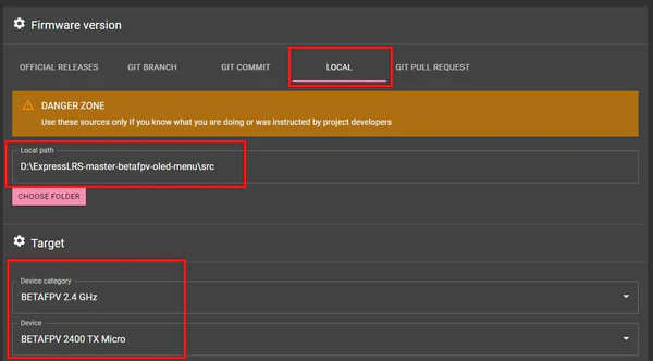 Second, open the ExpressLRS Configurator and load the upzip source code from local. Select the target device “BETAFPV 900/2400 TX Micro”. Now, you could setup your own binding phrase and other options as normal.