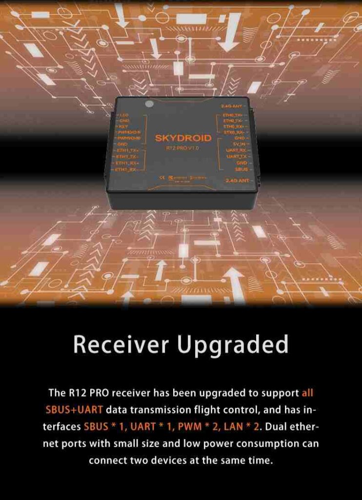- The Skydroid H12 Pro remote control features advanced wireless high-definition image transmission technology, developed exclusively by Yunzhuo Technology, ensuring seamless integration of remote control and video feed functionalities.
